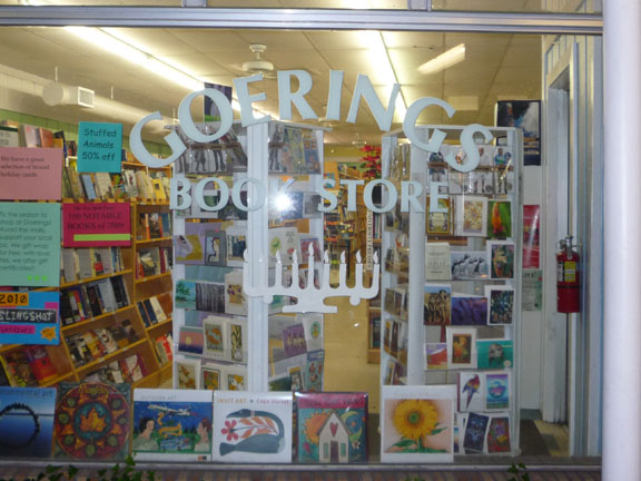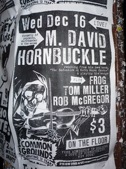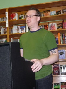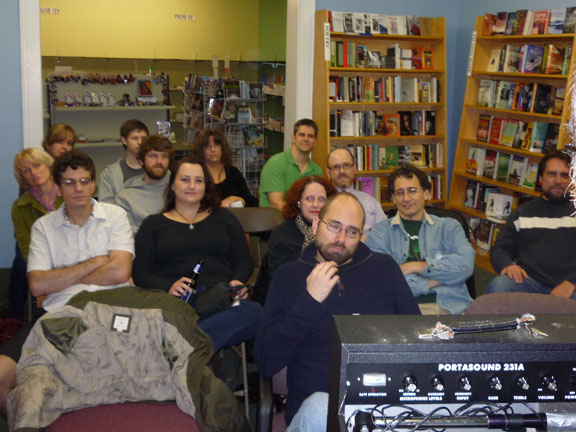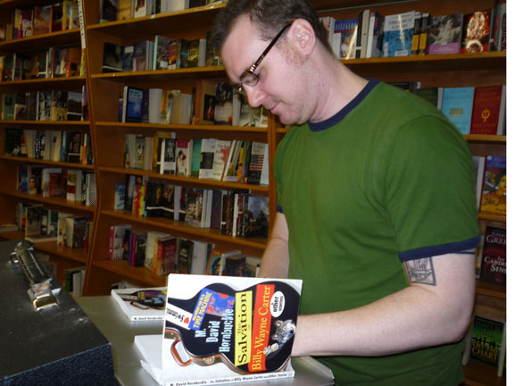 On my first full day back in Birmingham, I picked up my friend and former bandmate Brent Stauffer at the pizza place where he works and had a little lunch. Okay, in fact, it was a very BIG lunch–a calzone as large as my head. I had heard that a place called Green Cup Books was the place to go for independent authors like myself. So Brent and I headed over there, hoping to get a couple of books on the shelf and maybe arrange a last-minute reading while I’m in town. But alas, we found that the place was OUT OF BUSINESS. And recently too because there were still shelves full of books inside.